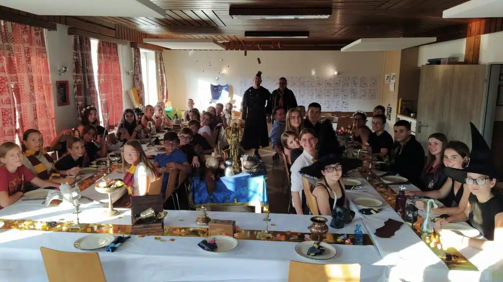 Après, a eu lieu le banquet de crêpes préparées par nos fées de la cuisine! C’était vraiment délicieux et nous avons passé de bons moments autour d’un bon repas dans la joie et la bonne humeur. Après ce délicieux festin, un groupe s’est proposé pour créer des animations telles que des sketchs comiques sur Harry Potter qui ont fait rigoler tout le public et un blind-test avec une petite course. Mais aussi un spectacle d’impro fait et présenté par tous. Cette soirée était drôle et amusante. Puis en fin de soirée nous avons fait une boum dans les salles communes. Lors de cette soirée nous avons tous passé un bon moment et nous sommes reconnaissants envers les monos d’avoir tout organisé.