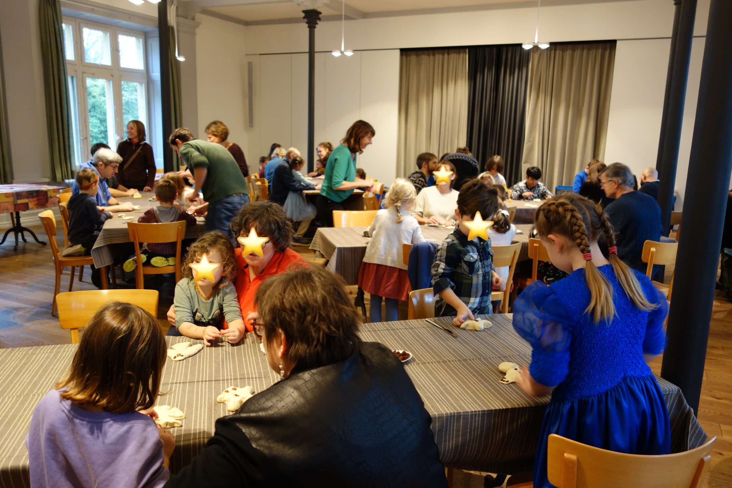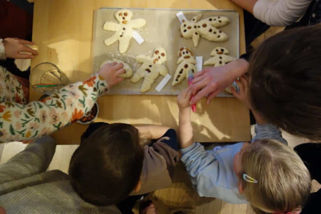 Un atelier boulangerie ouvre l’après-midi. Les enfants et les parents sont invités à confectionner un bonhomme en pâte. L’équipe pétrit à l’avance de la pâte en suffisance et prépare des pâtons. Sur les tables, on trouve noisettes, amendes et raisins secs pour décorer les œuvres culinaires. Chacun.e dépose ensuite son bonhomme sur les plaques de cuisson et le badigeonne de jaune d’œuf, sans oublier de lui glisser un petit billet avec son prénom pour le retrouver lorsqu’il sera tout doré.