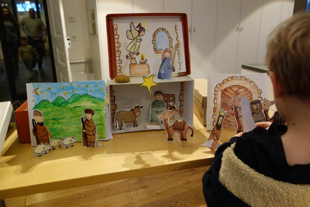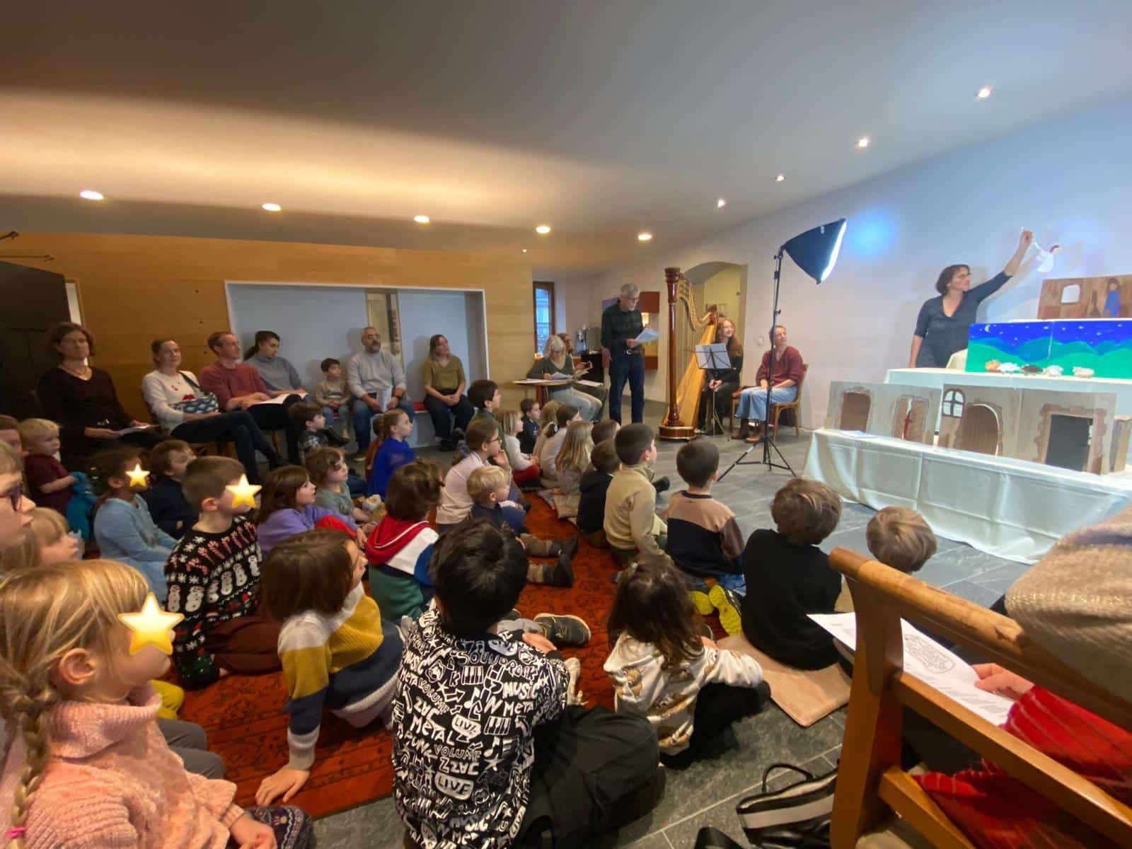 Pendant qu’une équipe s’occupe de la cuisson, tout le monde se dirige vers la salle de la cheminée. Parents et enfants chantent les classiques de Noël: « Il est né le divin enfant », « Voici Noël », « Entre le bœuf et l’âne gris », accompagnés par quelques musiciens. Vient alors le temps du récit. Chaque année sous une autre forme, selon la créativité et les envies de l’équipe bénévole.